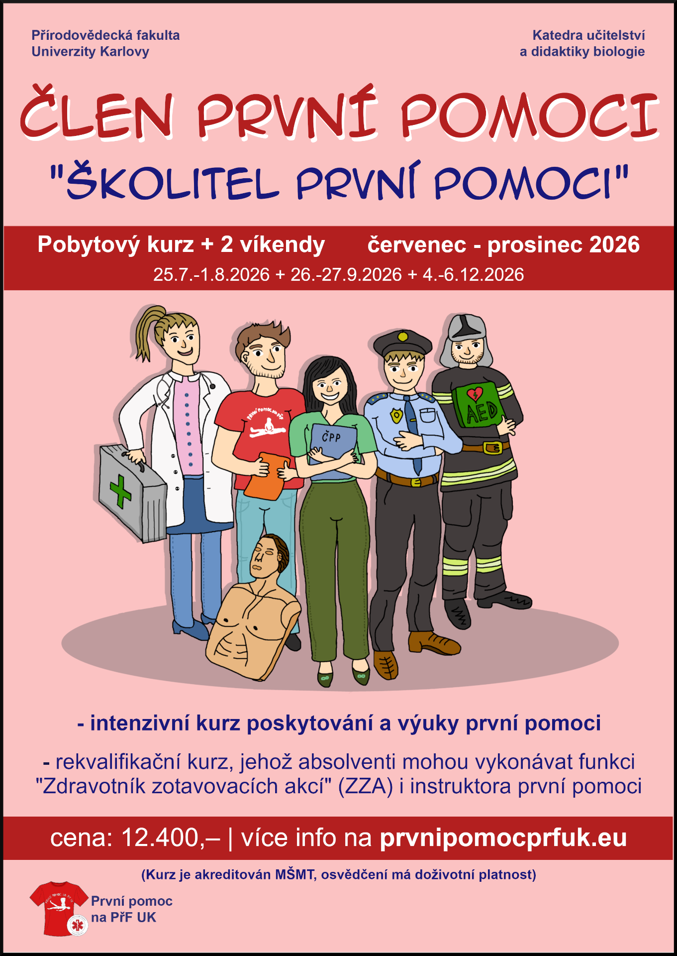 - Člen první pomoci je rekvalifikační kurz v rámci programů celoživotního vzdělávání PřF UK (akreditace MŠMT č. MSMT-5211/2024-3) v rozsahu 90 hodin.